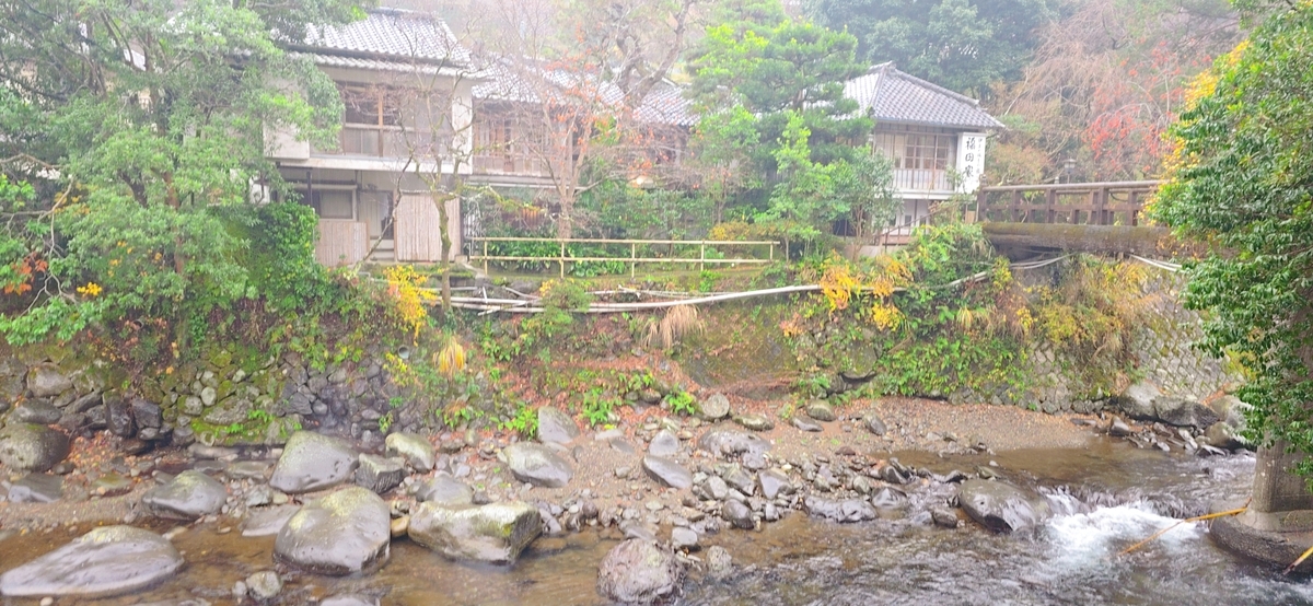 小説の中で「私」がいた榧(かや)風呂は、構造上、今は半地下のような場所にあります。対岸からだとどこがどこやら…。「あそこかな?」と目を凝らしてみるものの、確信は持てずじまいでした。
